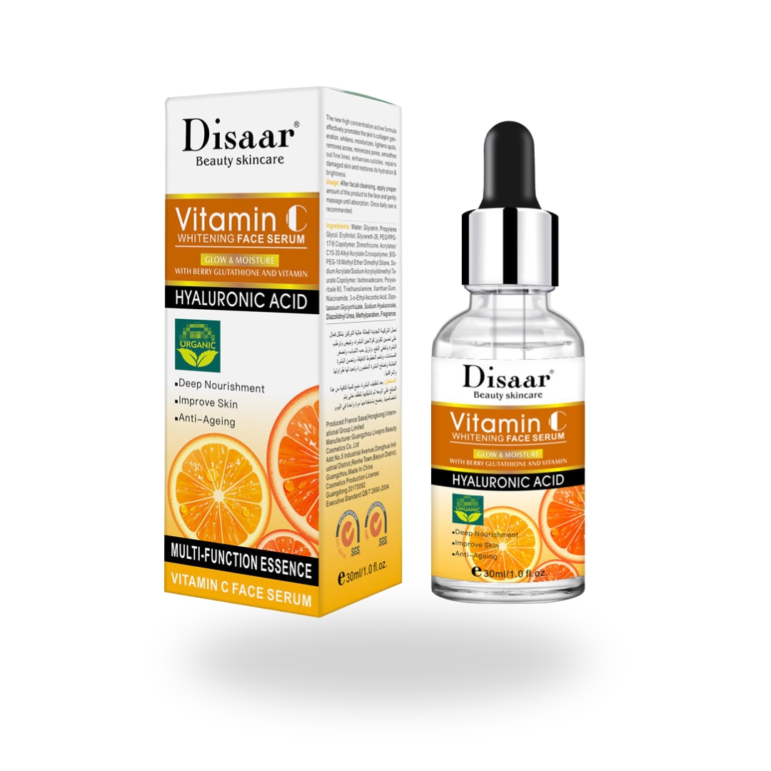 আপনার ত্বকের নিষ্প্রাণতা, দাগ এবং বয়সের ছাপ নিয়ে কি চিন্তিত? Glora Care আপনার জন্য নিয়ে এসেছে Disaar Vitamin C Whitening Face Serum – যা আপনার ত্বককে ভেতর থেকে পুষ্টি জোগাবে, উজ্জ্বল করবে এবং তারুণ্য ফিরিয়ে আনবে! এই মাল্টি-ফাংশনাল সিরামটি ভিটামিন সি, বেরি গ্লুটাথিয়ন এবং হায়ালুরোনিক অ্যাসিডের শক্তিশালী মিশ্রণ দিয়ে তৈরি, যা আপনার ত্বকের যত্নে এক নতুন মাত্রা যোগ করবে।